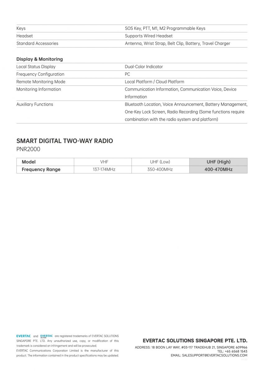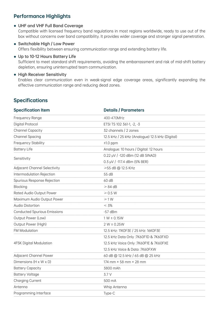 ● Single rotary knob combines push-to-talk and channel switching functions, allowing for easy one-handed operation. 32 channels with infinite rotation and voice prompts.